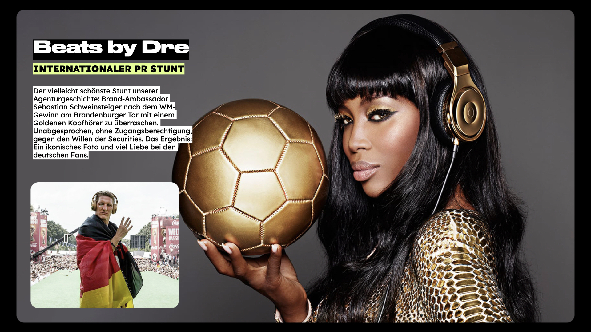 Unsere Vision für Beats by Dre war von Anfang an, eine starke Community aus Musikern, Sportlern und anderen Ambassadors mit hoher Glaubwürdigkeit zu schaffen. Dafür nutzten wir Seedings, waren ständig im Austausch und legten Wert auf individuell maßgeschneiderte Kooperationen. Ein weiterer wichtiger Baustein in unserer Kampagnenführung waren besondere Events auf Grundlage unseres Culture Calendars - also rund um wichtige Konzerte, Sport-Highlights wie Fußball-WM, Messen und anderes. Genau so wichtig für die 360 Grad Betreuung: Klassische PR von Testberichten und Produktneuheiten bis hin zu großen Interviews mit dem Markengründer Dr. Dre, CEO Luke Wood und anderen wichtigen Markenpersönlichkeiten.
