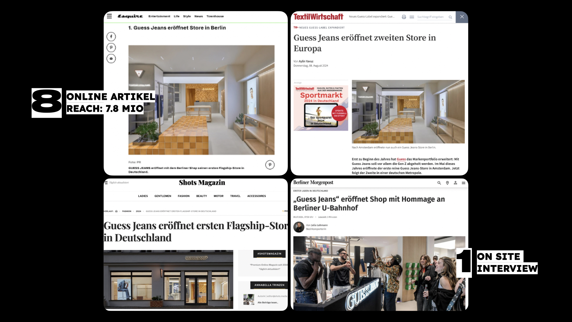 We delivered a tailor-made PR and communications mix for GUESS JEANS that immediately caught on. This included targeted fashion PR, exciting storytelling, events and influencer relations - at the same time, we laid the foundation for an active brand community to anchor GUESS JEANS as a real love brand in the German market in the medium term.