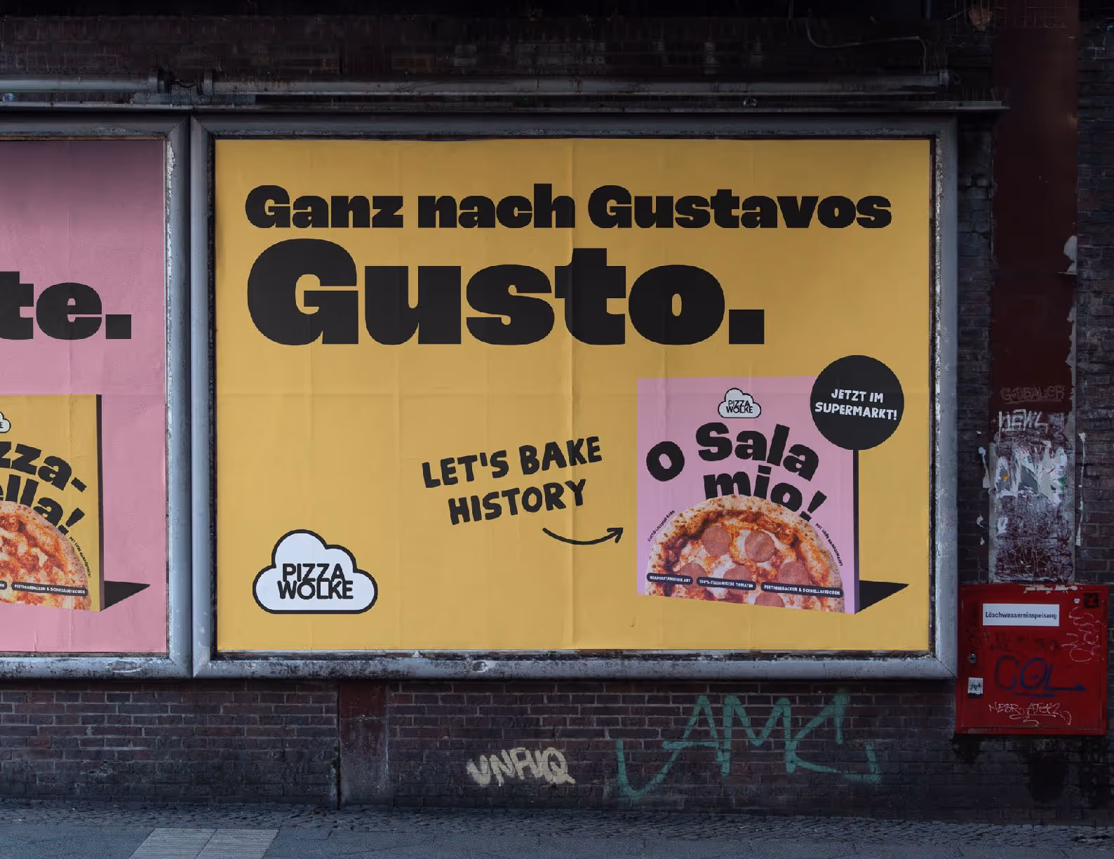 We took charge of strategy, tone of voice, visual identity, packaging, campaigns, and social media, all with the goal of capturing the true spirit of the brand and transforming it into something that not only looks amazing but also thrives in retail and wins over customers. Another key element of our Pizza Wolke strategy: community-driven pizzas, such as collaborations with BroSieben and the Fokus Clan gaming community. We call it: Street Crustibility. Let’s bake history!